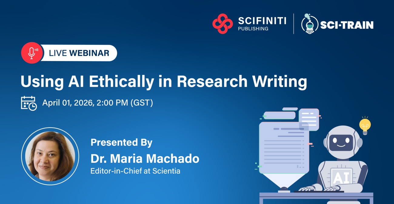 Scifiniti Publishing is pleased to announce its upcoming webinar, scheduled for April 1, 2026, at 2:00 PM GST, in collaboration with Sci-Train. The session, titled “Using AI Ethically in Research Writing,” will be presented by Dr. Maria Machado, Editor-in-Chief at Scientia. This webinar marks the second collaboration between Scifiniti Publishing and Sci-Train.